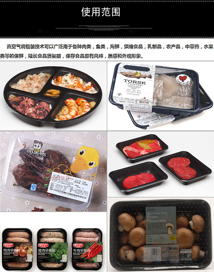 真空氣調(diào)包裝技術(shù)可以廣泛應(yīng)用于各種肉類,魚類,海鮮,烘焙食品,乳制品,農(nóng)產(chǎn)品,中草藥,水果類等的保鮮,延長(zhǎng)食品貨架期